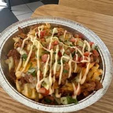 Golden crispy waffle fries topped with pulled pork shredded cheese pineapple salsa and house made aioli sauce